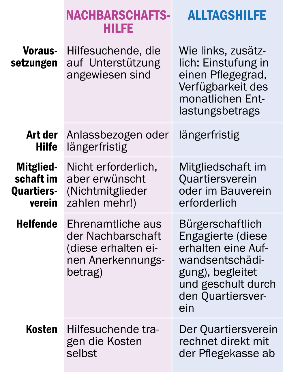 Der gemeinnützige Verein Quartierstreff Bauverein Breisgau e.V. bietet mit der Nachbarschaftshilfe und der Alltagshilfe zwei Formen nachbarschaftlicher Unterstützung an.