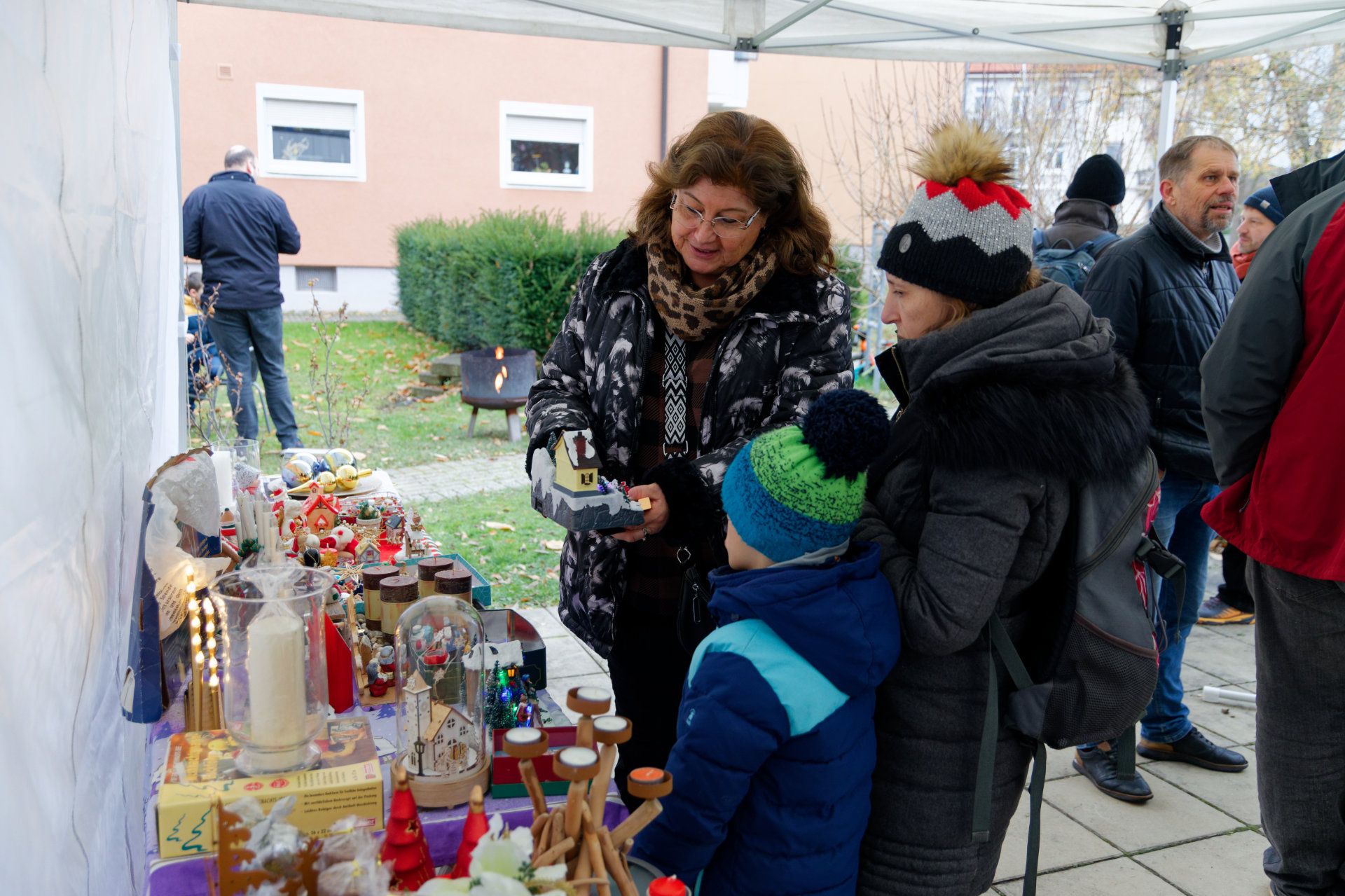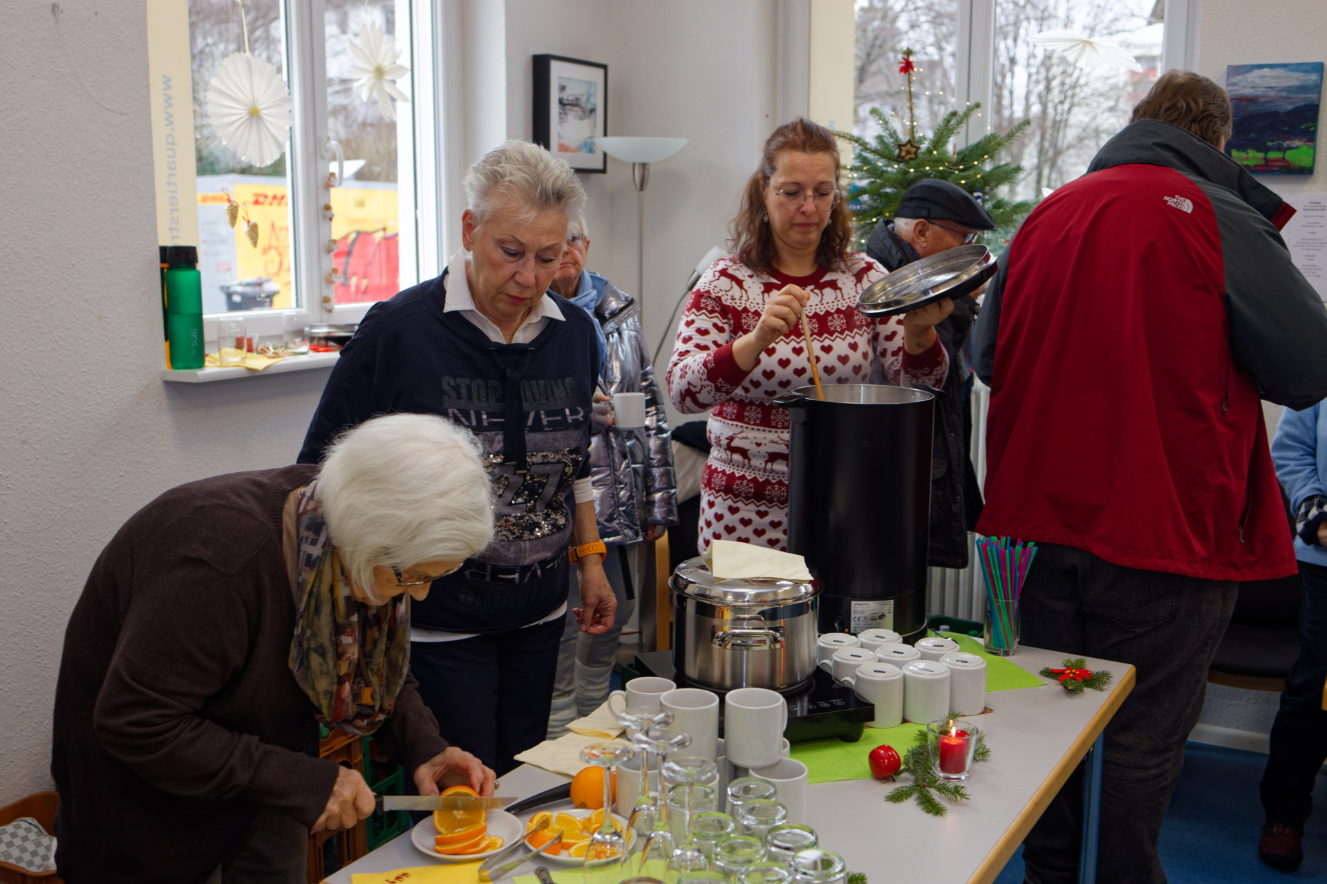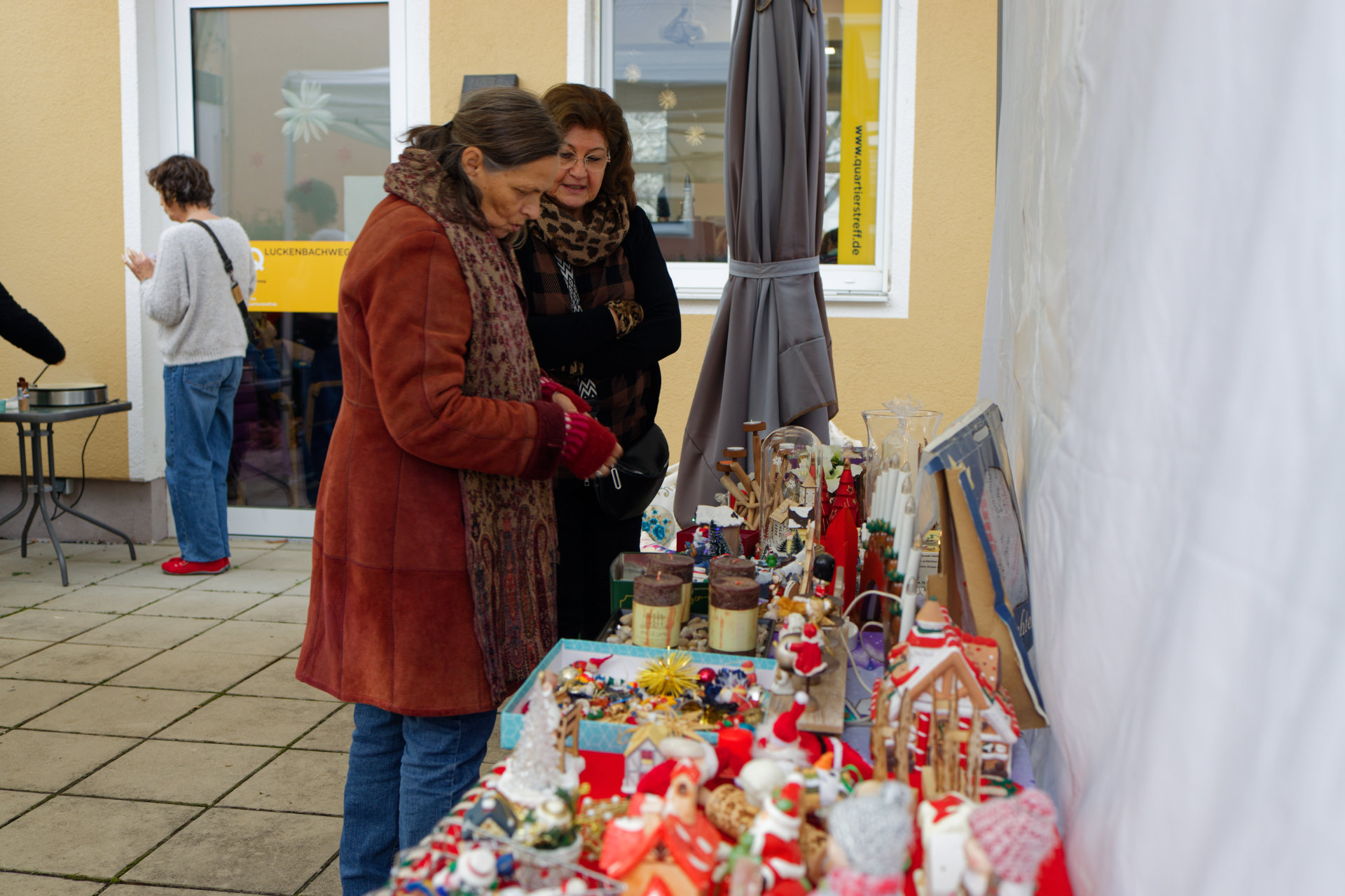 Am Wochenende vor dem 1. Advent platzte der Quartierstreff Luckenbachweg aus allen Nähten: zahlreiche Nachbarinnen und Nachbarn waren gekommen, um in stimmungsvoller Atmosphäre einen fröhlichen Nachmittag miteinander zu verbringen. Hier gab es Gelegenheit kleine Geschenke zu kaufen und auch leckerer Kuchen, knackige Wienerle und heiße Getränke waren gut nachgefragt. Wem es innen zu voll war, der konnte Punsch oder Wurst auch auf der Terrasse genießen und sich an der Feuerschale aufwärmen. (Fotos: Stephan Seyl)