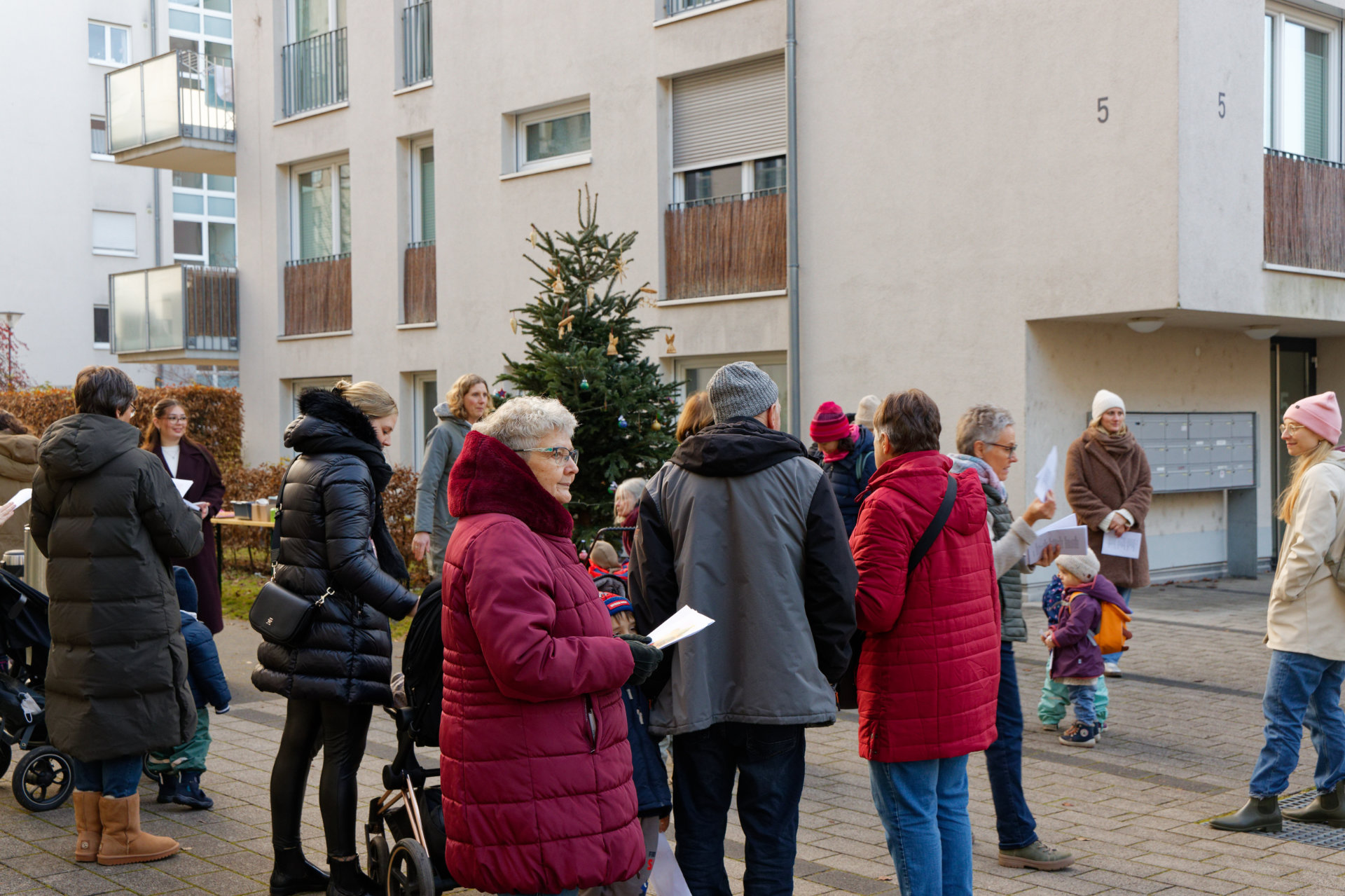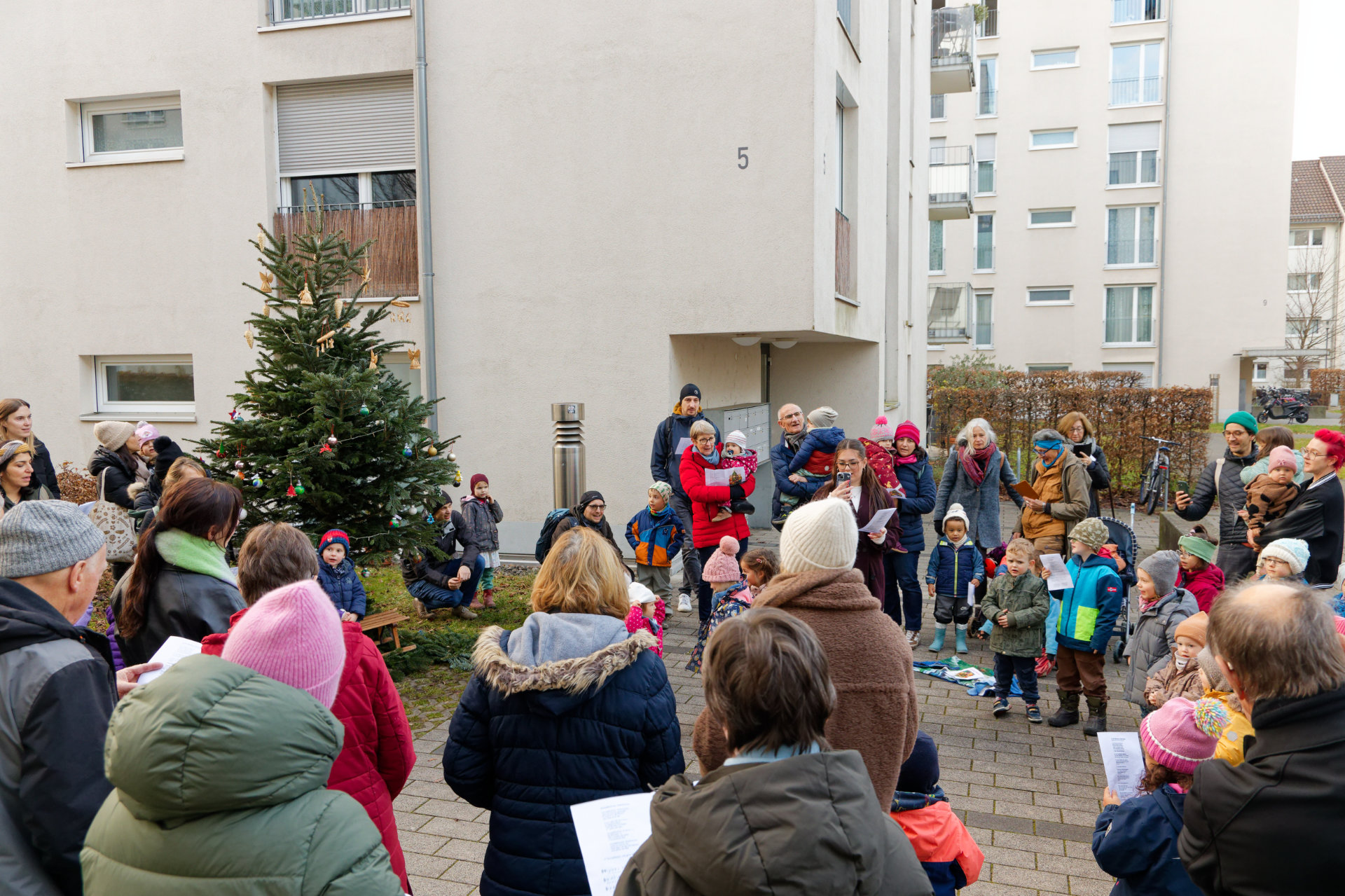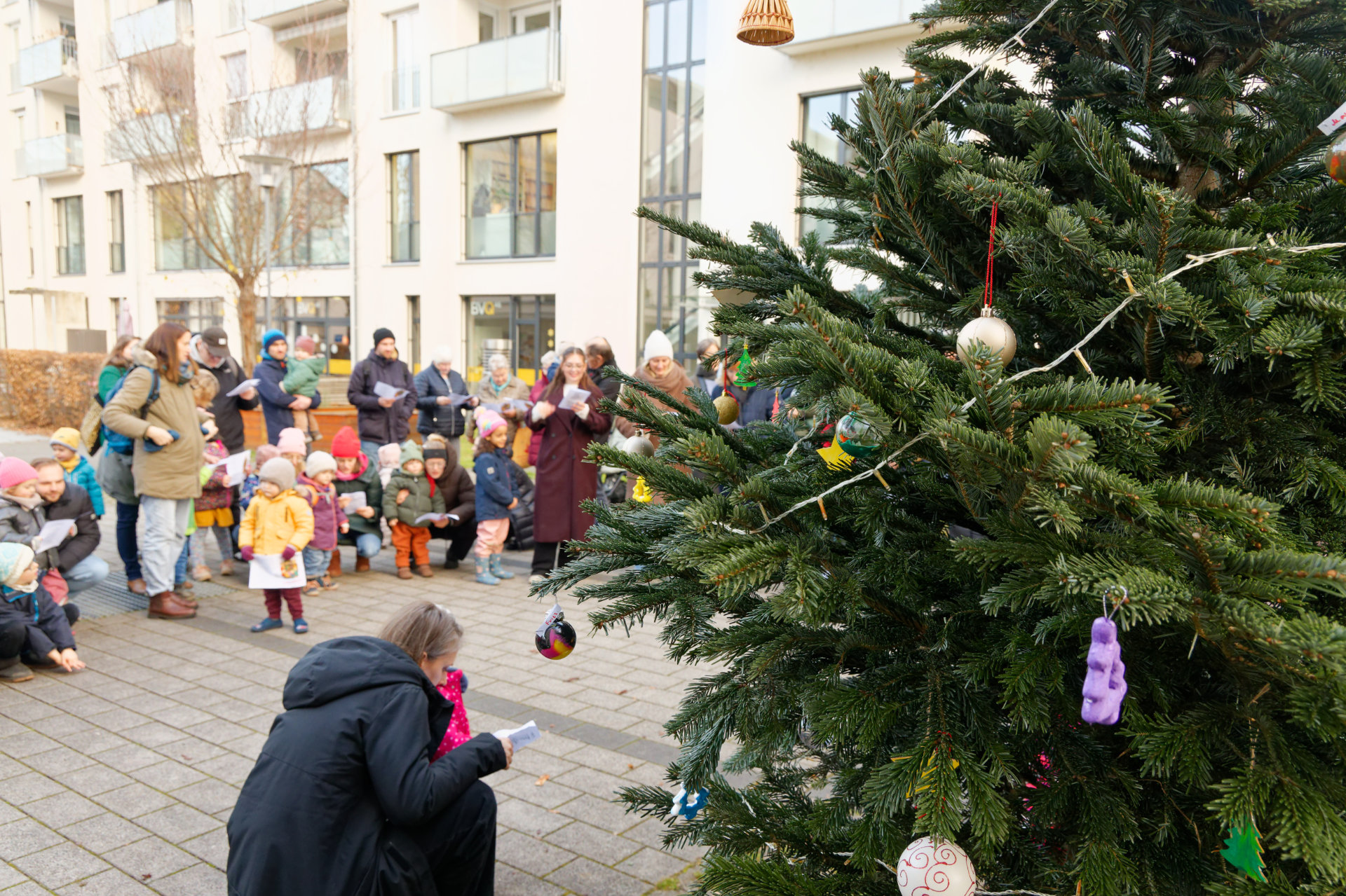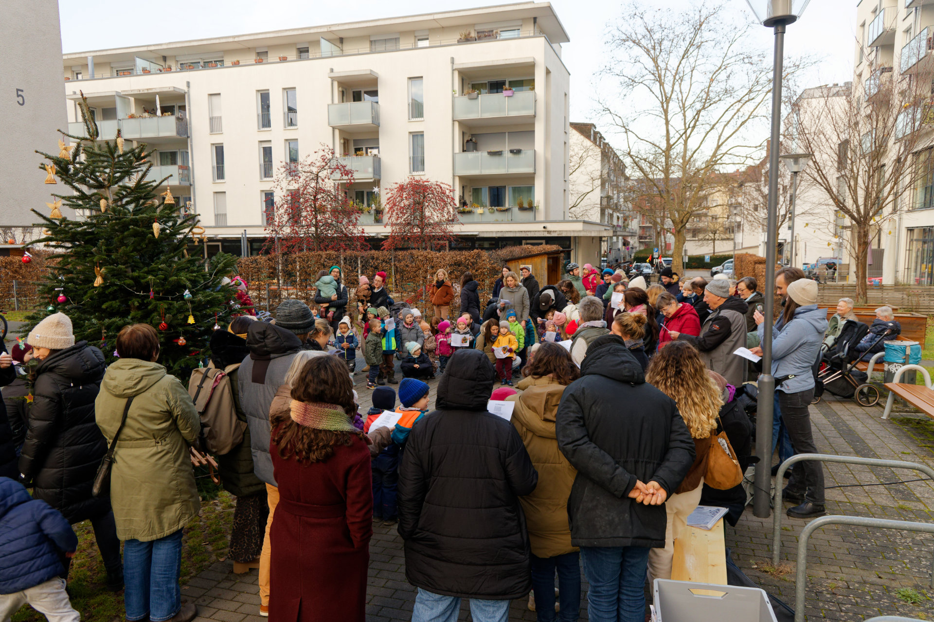 Anfang Dezember fand im Innenhof des Quartiers wieder eine gemeinsame Aktion der Junikäfer-Kitas und des Quartierstreffs Qu46 statt: Die Kita-Kinder hatten den zuvor aufgestellten Weihnachtsbaum geschmückt. Nachmittags tragen sich Nachbarn, Kita-Kindern und ihre Eltern zum gemeinsamen Singen von Weihnachtsliedern. Bei Punsch und Weihnachtsgebäck konnten sich die Teilnehmenden stärken und die vorweihnachtliche Stimmung genießen.